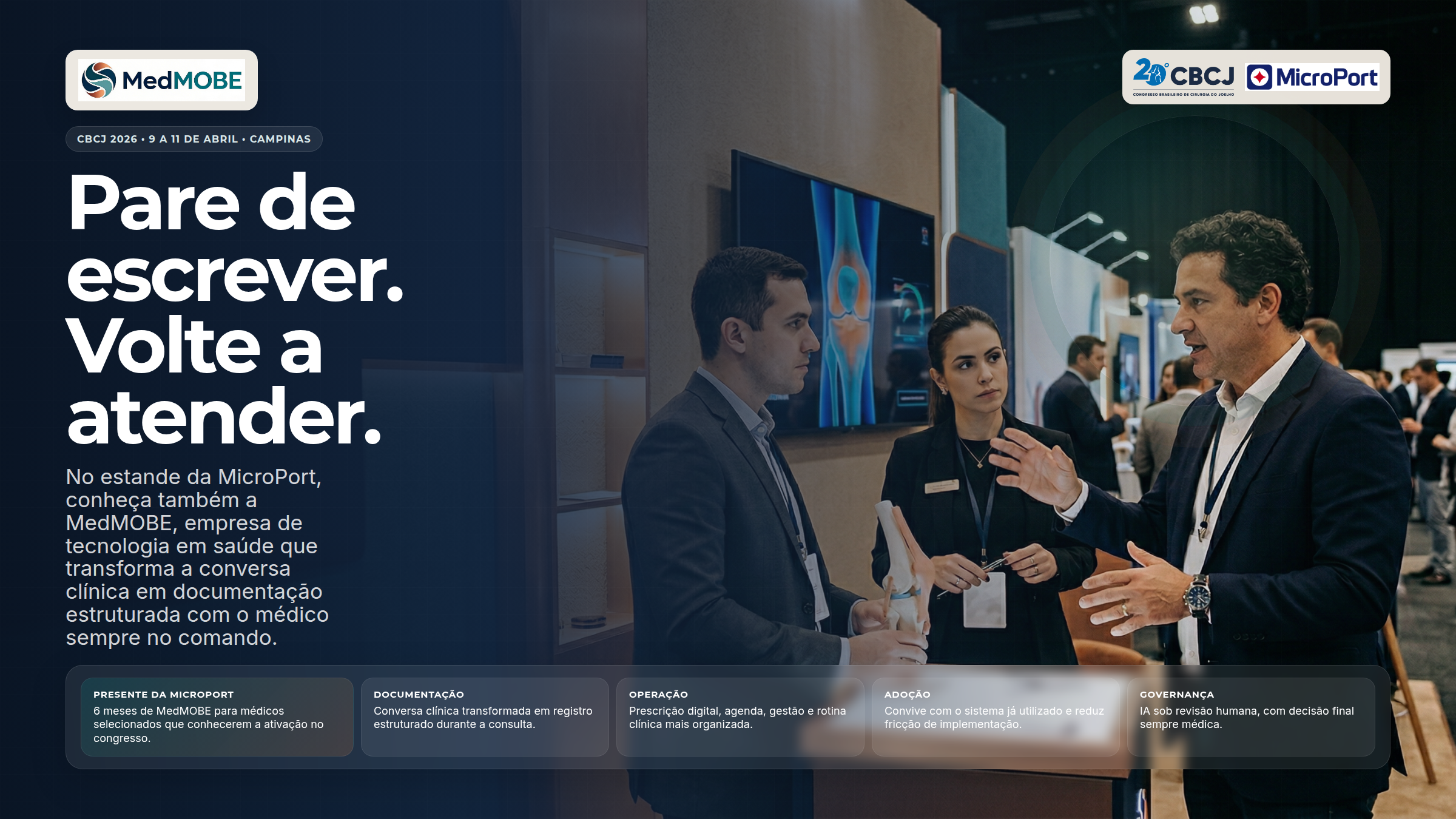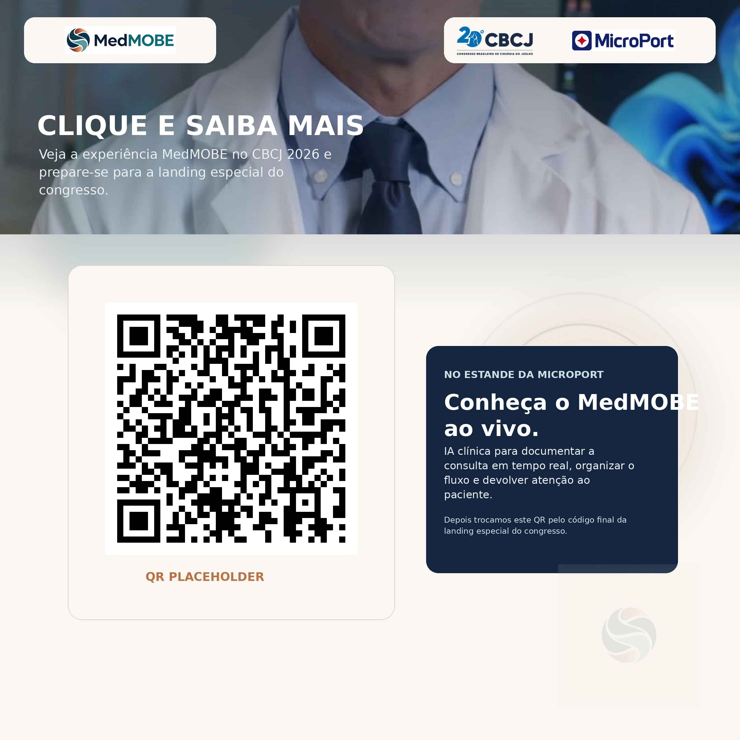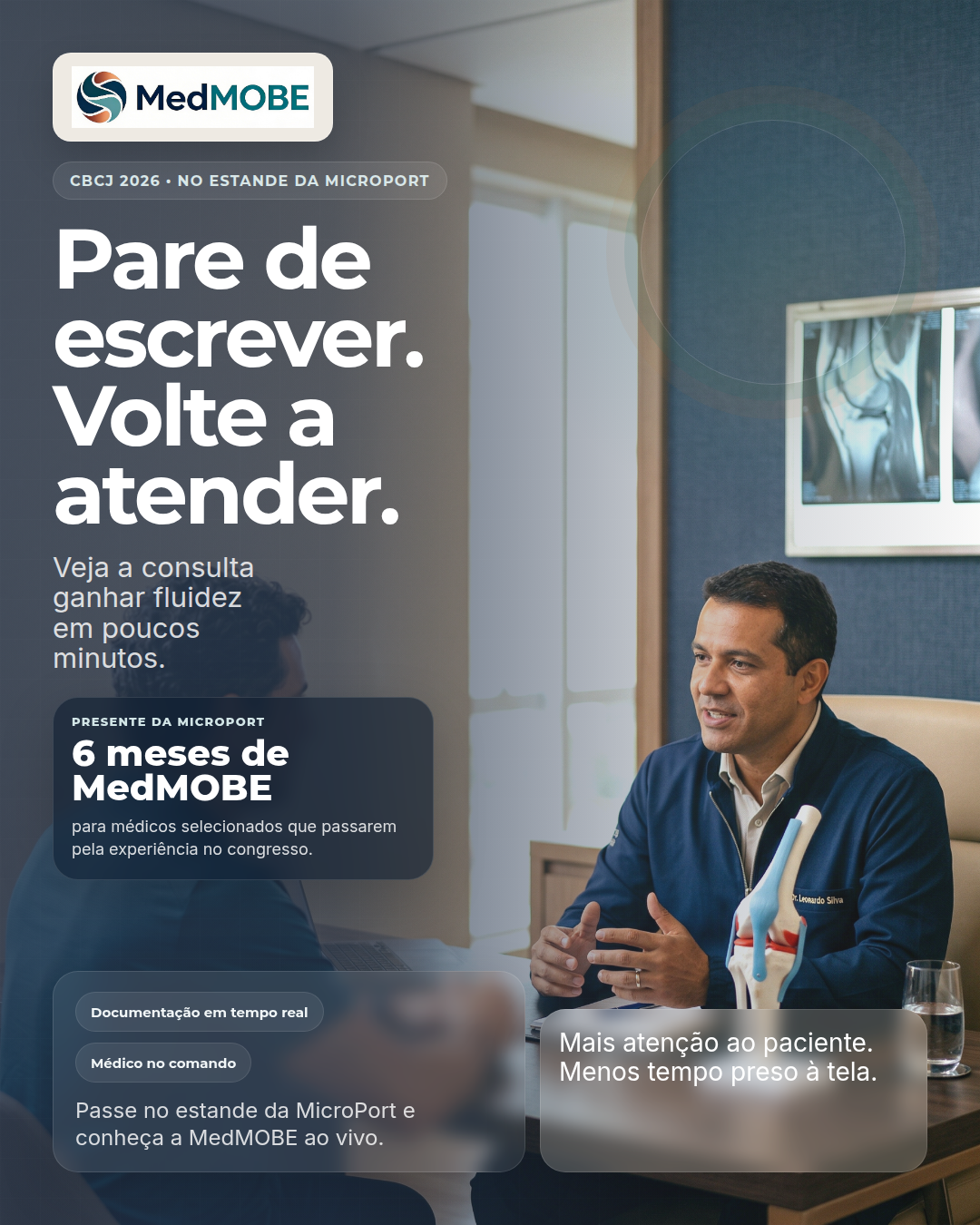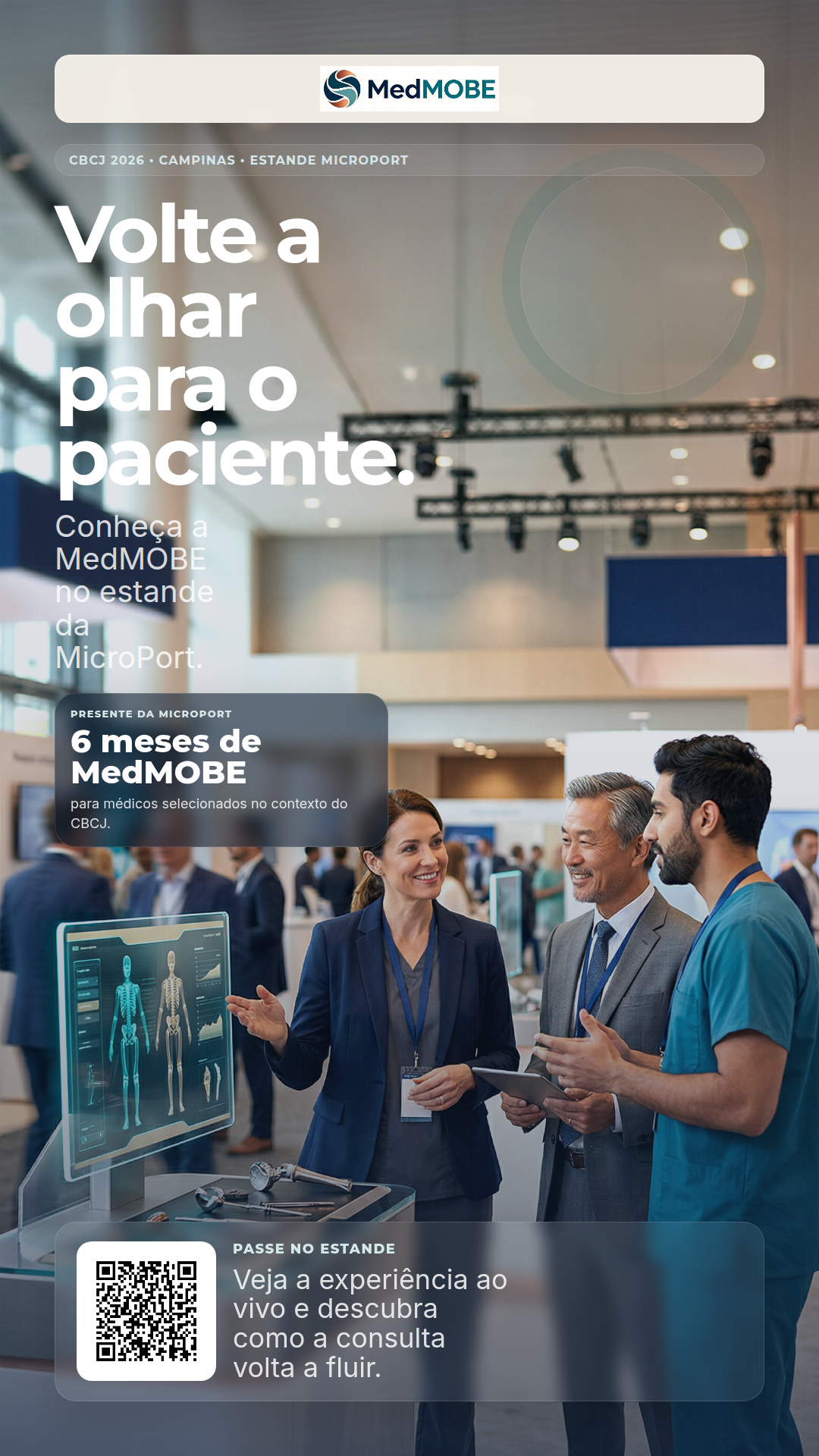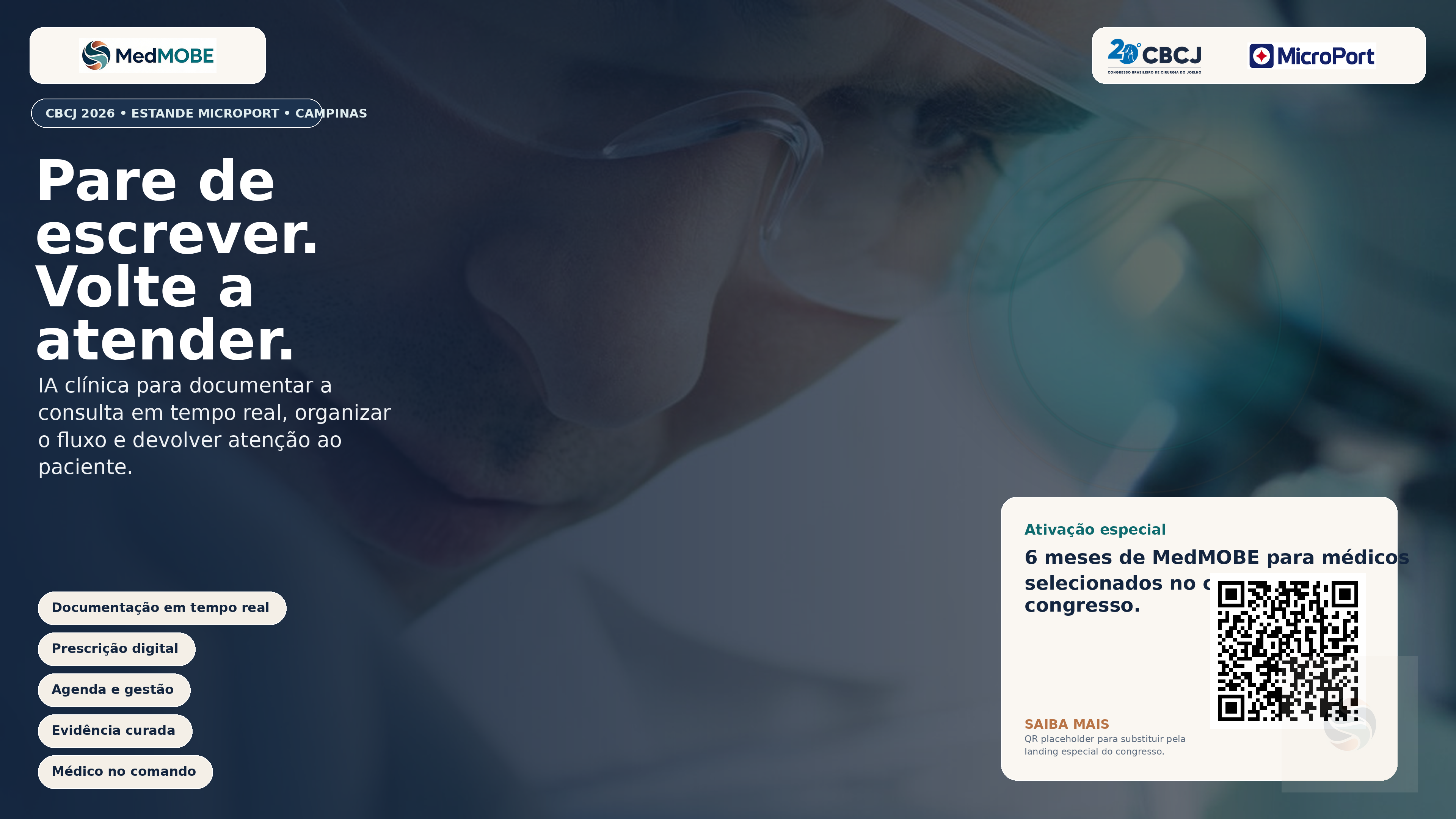 Campanha do CBCJ 2026 pensada para gerar desejo, visita ao estande e follow-up comercial sem descaracterizar a MedMOBE como uma health tech independente. No estande da MicroPort, Skywalker, Medial Pivot e soluções com óculos inteligentes fazem a abertura. A MedMOBE entra como parceira de tecnologia em saúde para o consultório.