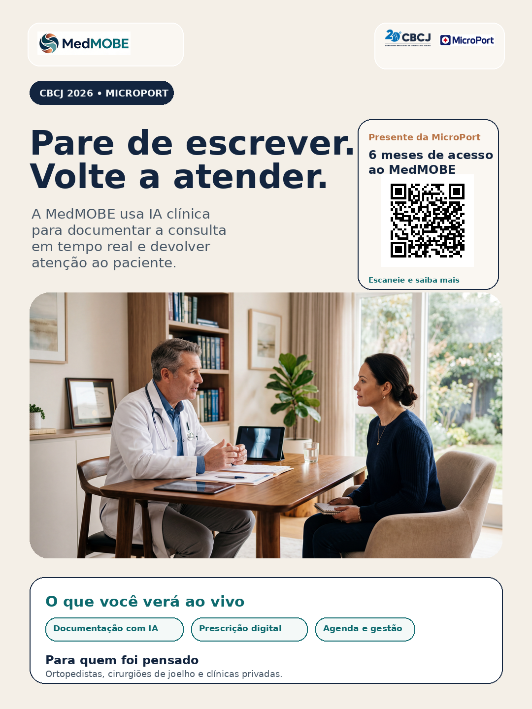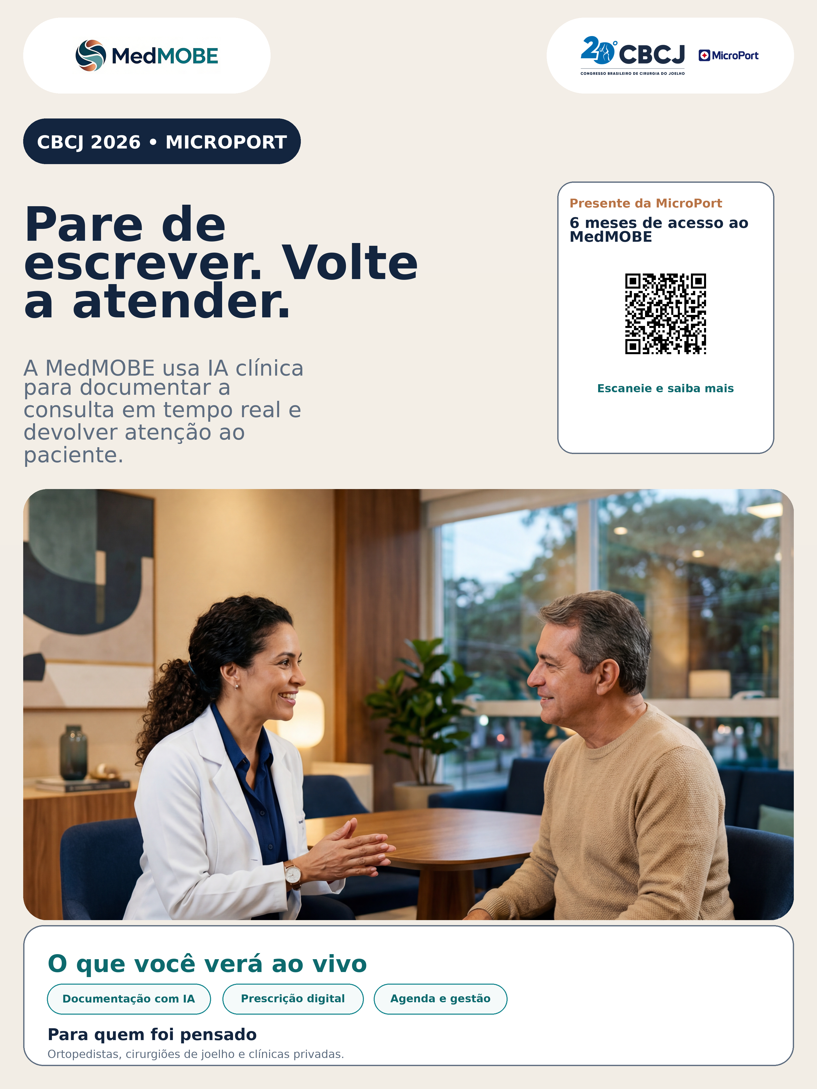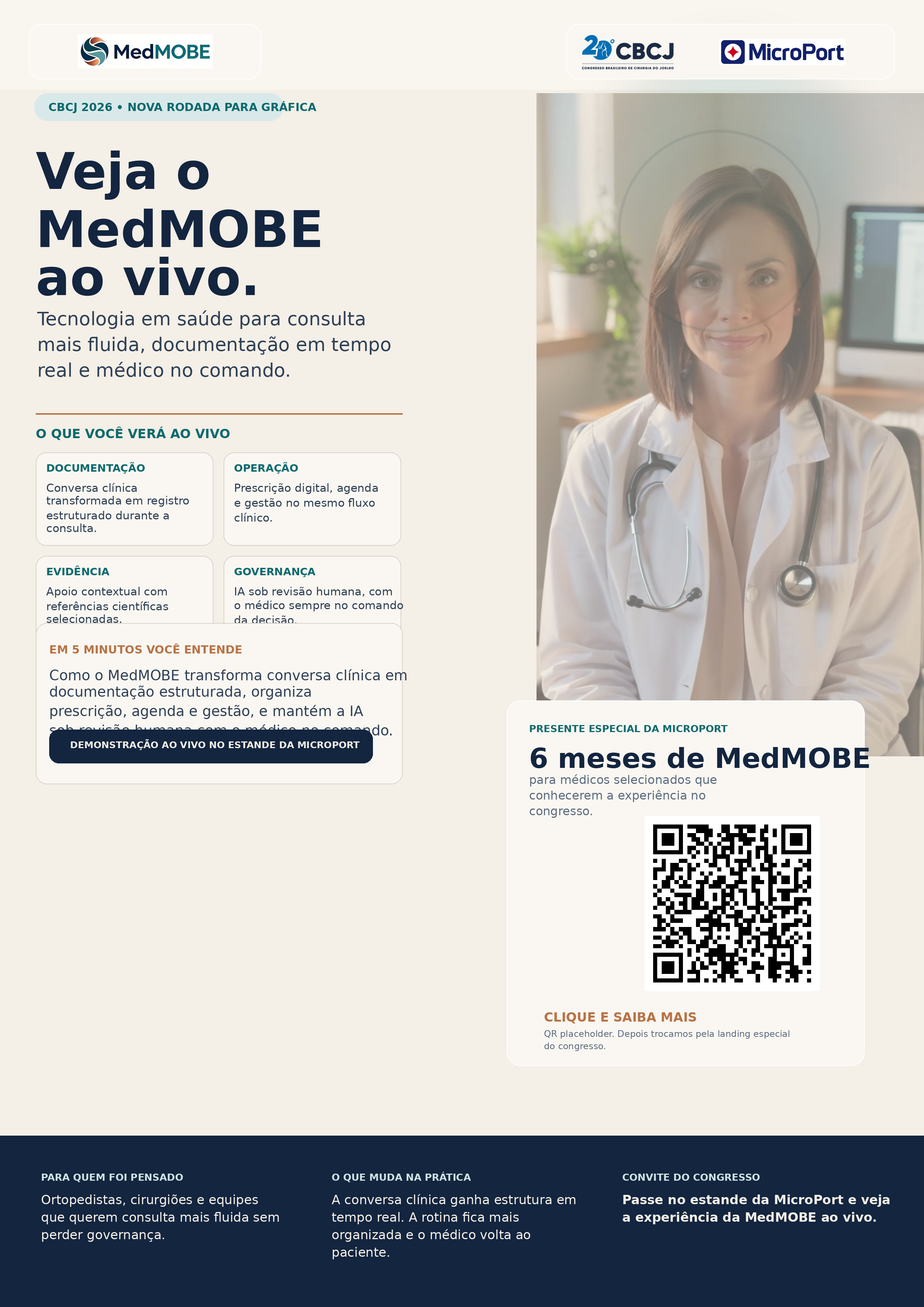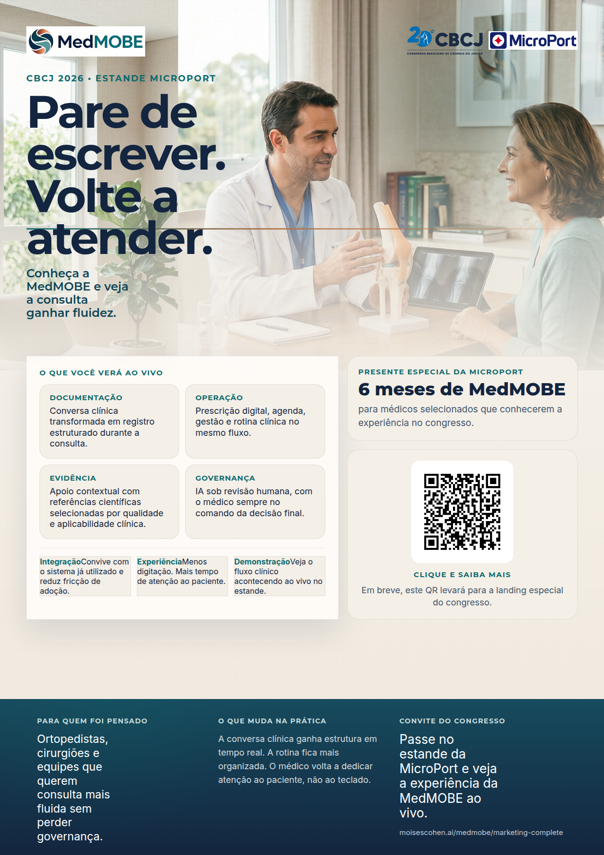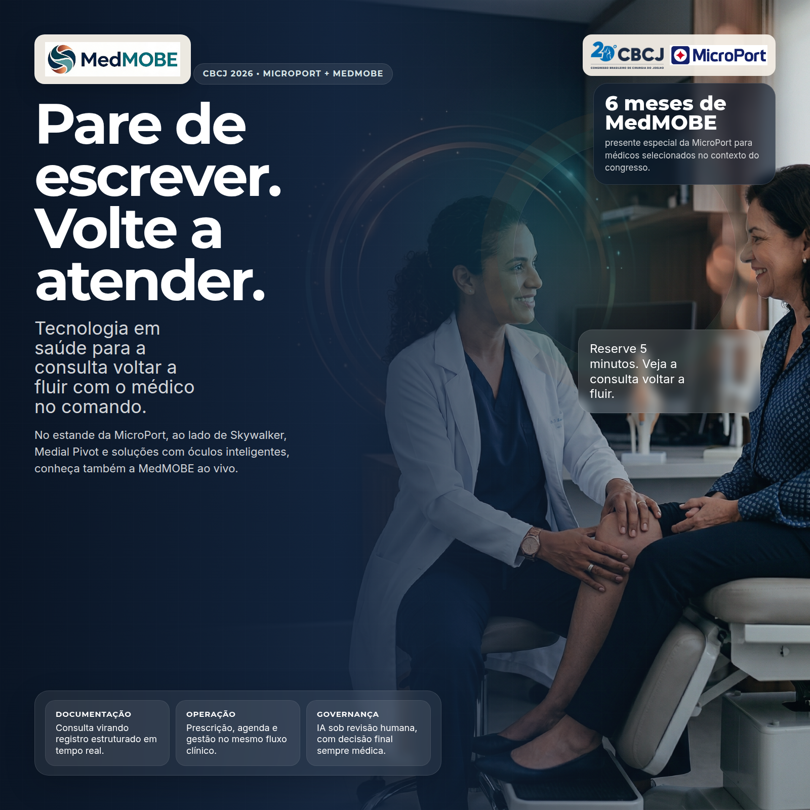 Campanha do CBCJ 2026 pensada para gerar desejo, visita ao estande e follow-up comercial sem descaracterizar a MedMOBE como uma health tech independente. No estande da MicroPort, Skywalker, Medial Pivot e soluções com óculos inteligentes fazem a abertura. A MedMOBE entra como parceira de tecnologia em saúde para o consultório.