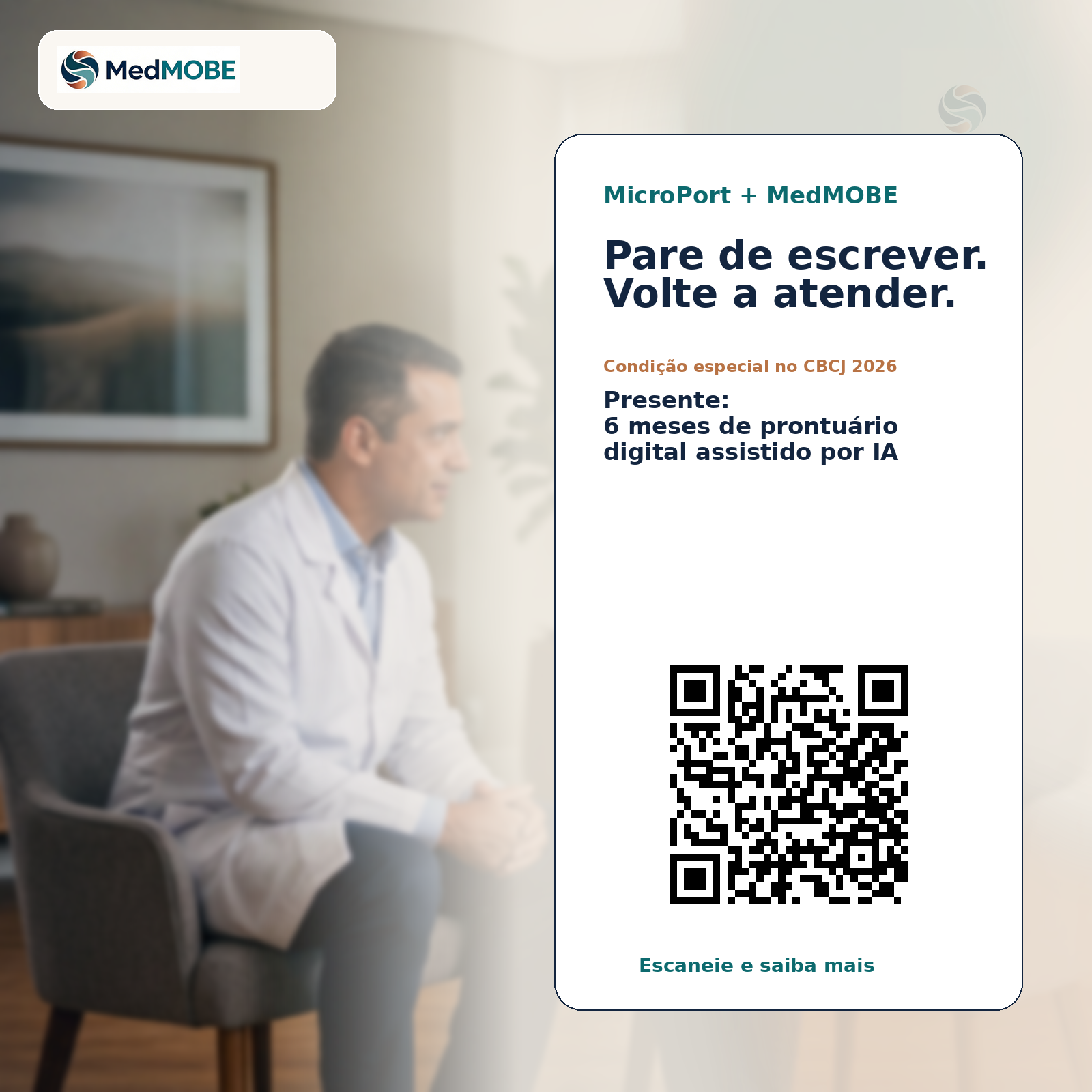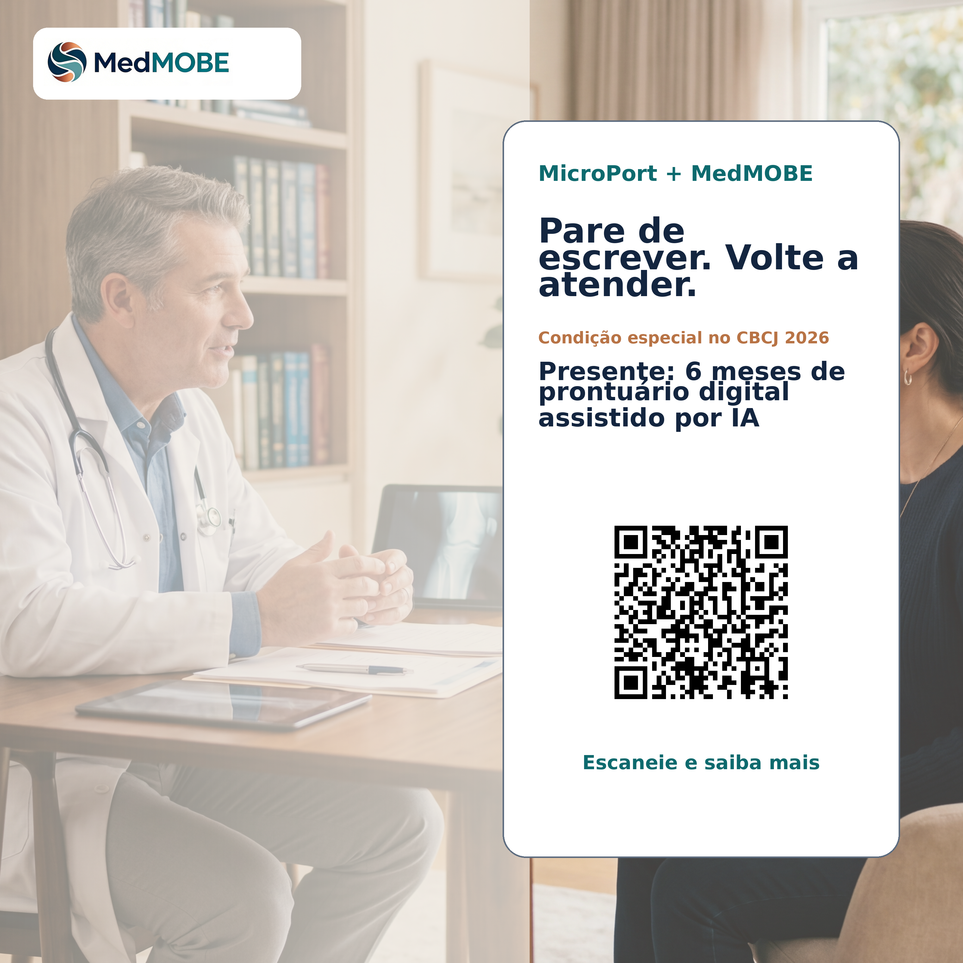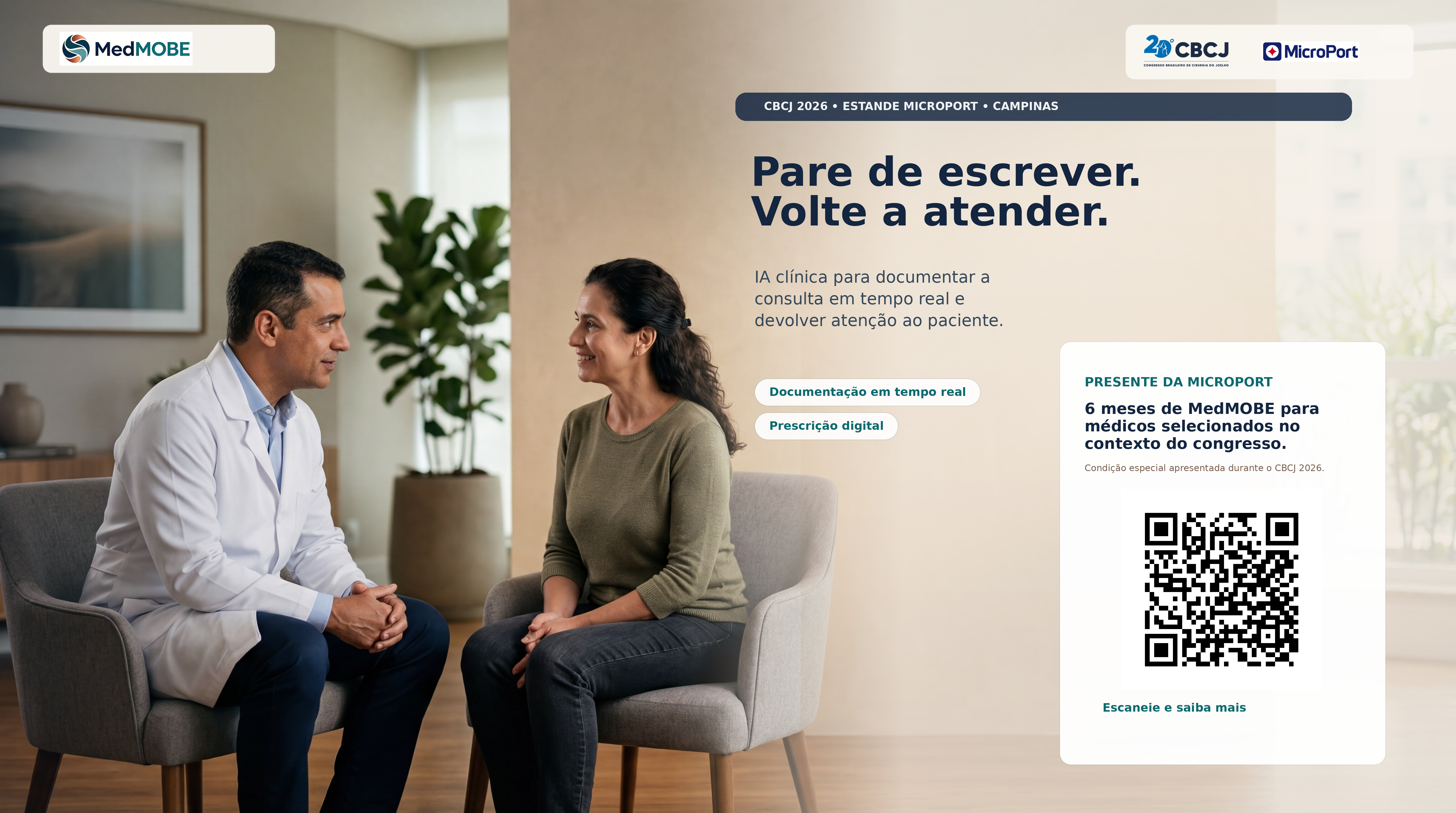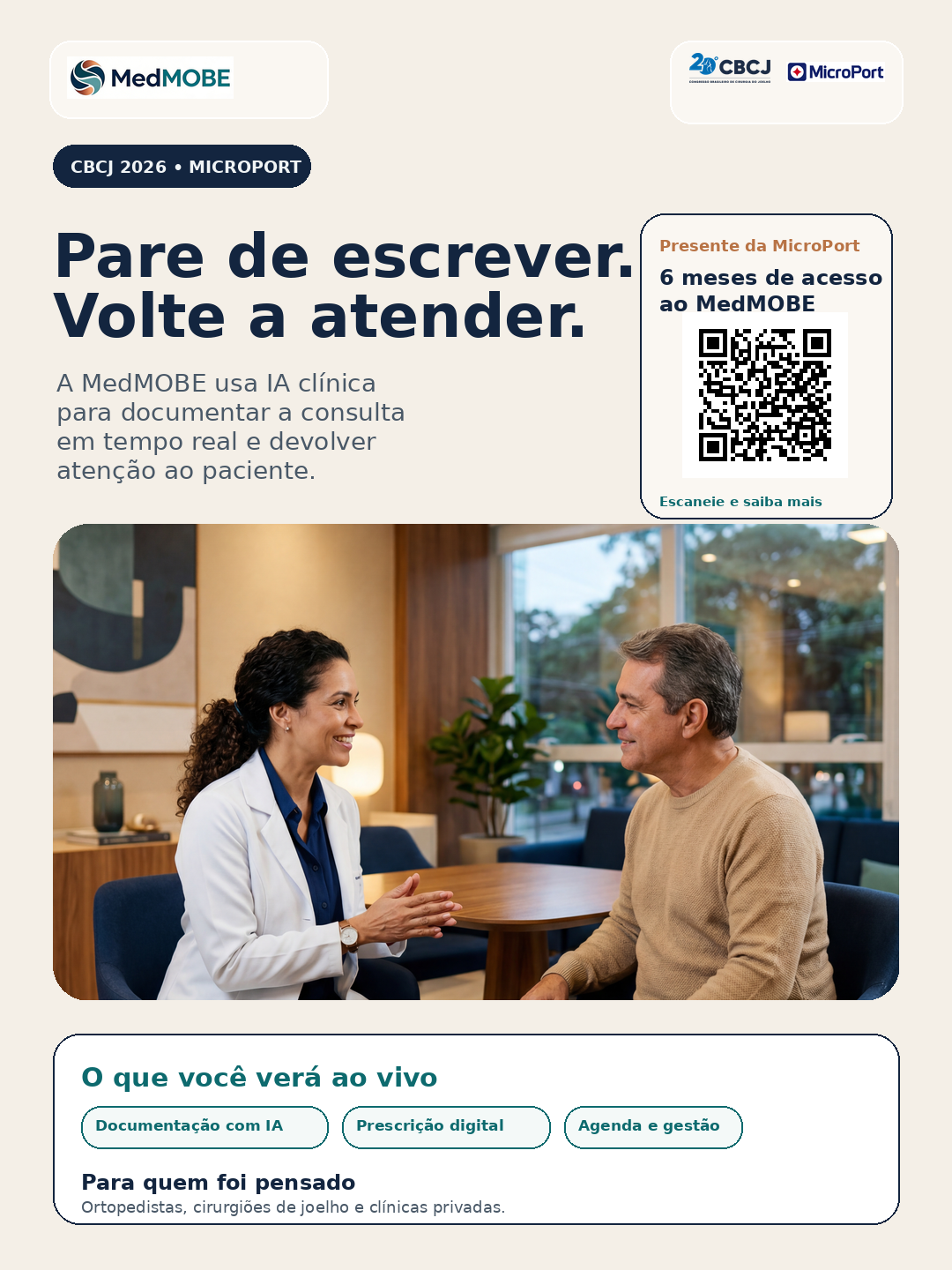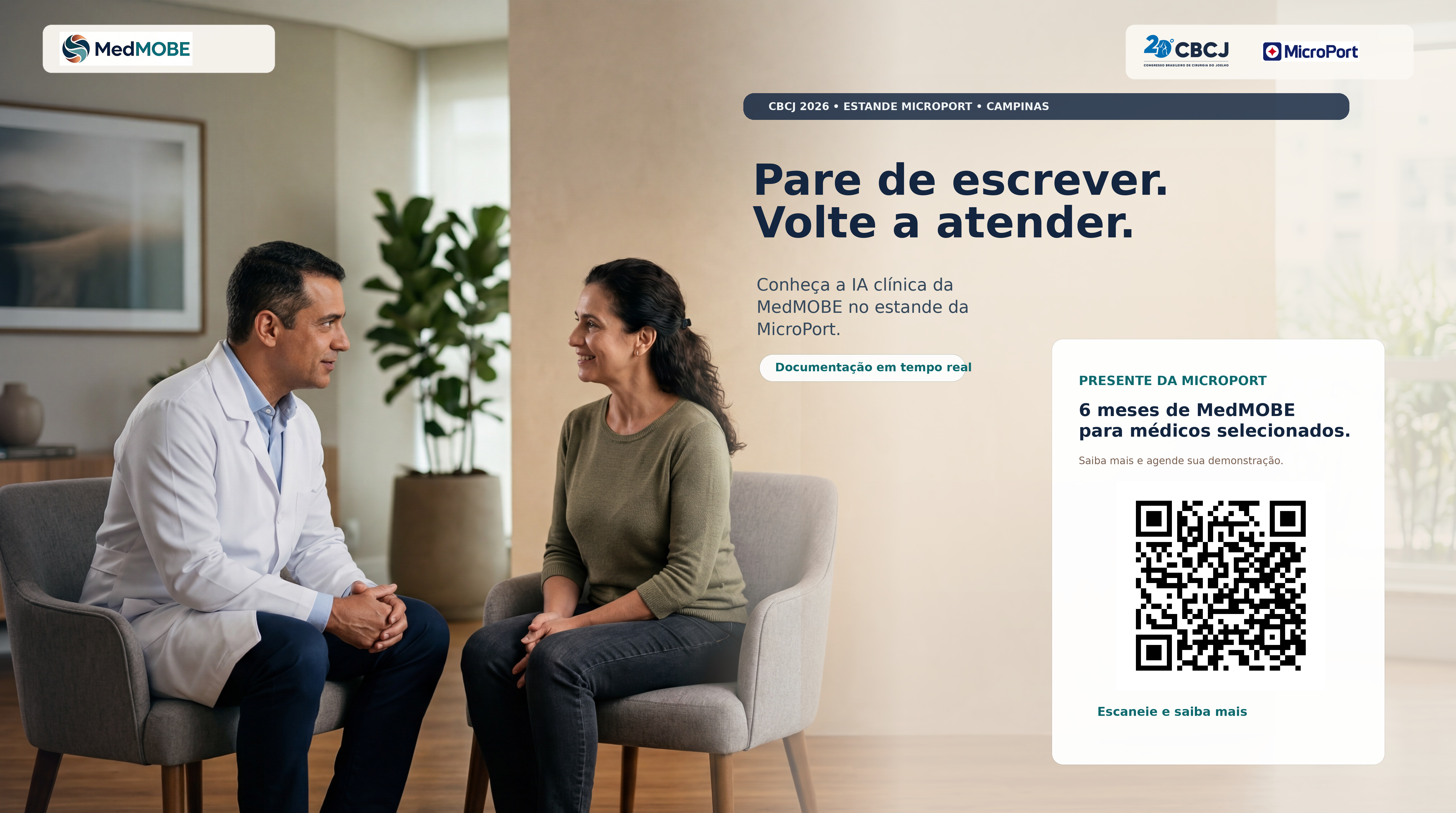 Campanha do CBCJ 2026 pensada para gerar desejo, visita ao estande e follow-up comercial sem descaracterizar a MedMOBE como uma health tech independente. No estande da MicroPort, Skywalker, Medial Pivot e soluções com óculos inteligentes fazem a abertura. A MedMOBE entra como parceira de tecnologia em saúde para o consultório.